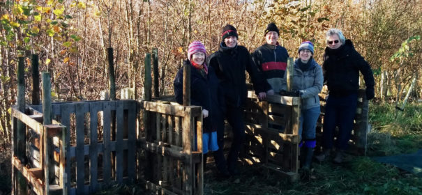 26th November 2017 – Today we built three compost bins, using old pallets and posts recycled from the tree fortresses. We’ll fill them with mowings, prunings, and the left over pulp from juicing events over the coming years.