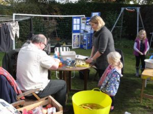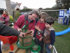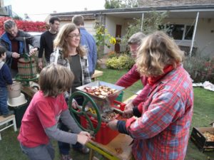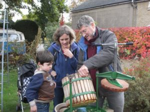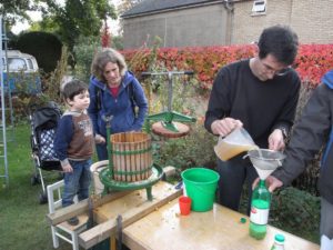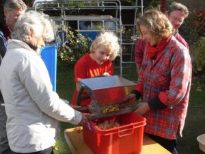 Thankfully the apples kept coming in on the day and it was a great success. Many families came, bringing their apples to enjoy the fun of making apple juice. We had a very productive conveyor belt of activities as people were washing, chopping, macerating, pressing, and bottling. The children were fabulous in their enthusiasm and physical stamina which is especially needed to turn the macerator. Then it’s all hands on deck to keep the apple press squeezing the juice out of the apples.