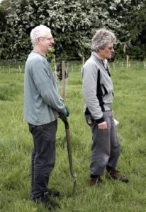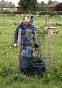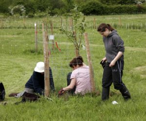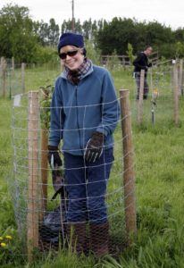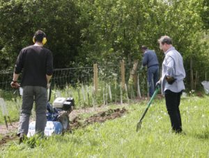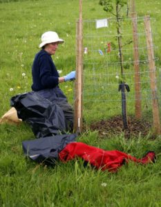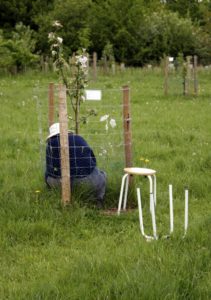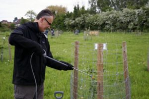 Other volunteers got on with spraying the trees with the garlic-based organic spray we have been using this past year and clearing out weeds from within the protective enclosures that encircle the young trees.
