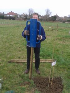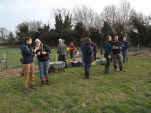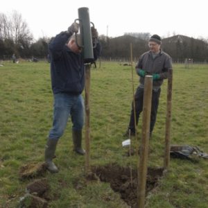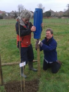 On Saturday, 8 March we were finally able to plant our next twelve trees, having previously been delayed a month by heavy rain and water-logged ground. Prior to the planting day, we had marked out the tree positions and put down two loads of woodchip to create a dry path to the Orchard swing gate.