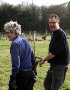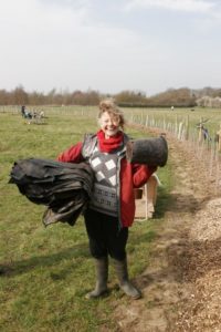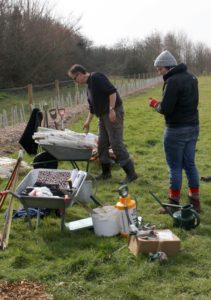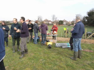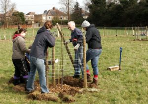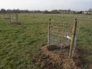 On the day the weather was ideal, and over 20 volunteers turned out to plant the trees in the ‘Orchard Parkland‘ area. The trees, which are all grafted on a vigorous rootstock, comprise apples, pears, cherries, a gage, a mulberry, a medlar and a quince. Once the trees had been planted, protective cages were constructed round each one to protect against muntjac deer and rabbits.