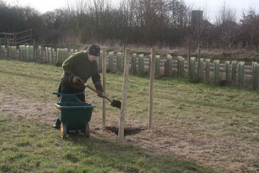 Turf was lifted, holes were dug, post holes were drilled, posts were knocked in, and some stock fencing protection was wrapped around the posts – all in preparation for the planting of the first trees next weekend – Saturday 23rd February. (If you want to come along and be part of the first tree planting on the site, then turn up around 10:00-10:30 AM next Saturday.)
